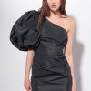 robe courte à manches longues avec broderie de sequins partout et encolure asymétrique agrémentée de maxi fronces en tulle sur le bord. pièce ajustée avec jupe fourreau courte. – le mannequin mesure 177 cm et porte une taille 40.