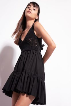 robe courte sans manches avec débardeur en maille de coton mélangé ajouré et jupe en popeline de coton légèrement évasée et à volants. agrémenté d’un nœud au milieu à l’arrière. – le mannequin mesure 178 cm et porte une taille 40.