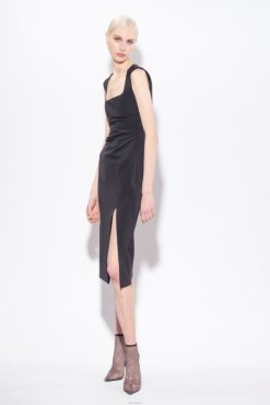 robe longueur mi-mollet en viscose technique fluide et stretch avec une texture distinctive d’aspect néoprène. coupe slim, encolure carrée avec bonnets moulés effet corset, manches longues et fente centrale à l’ourlet arrière. Fermeture zippée centrale dissimulée au dos.