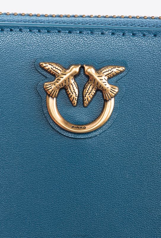 Portefeuille zippé de forme carrée en cuir doux et soyeux, orné d’une plaque Love Birds taillée en diamant sur une base en cuir. intérieur doublé en polycoton. fermeture zippée.