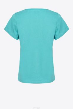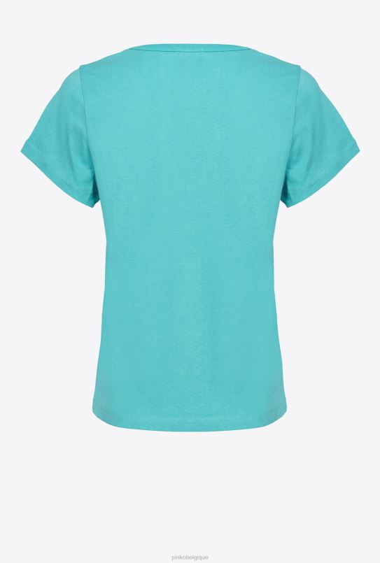 T-shirt à manches courtes en jersey de coton avec col en V côtelé et petit imprimé inséparables Pinko sur le côté gauche devant.