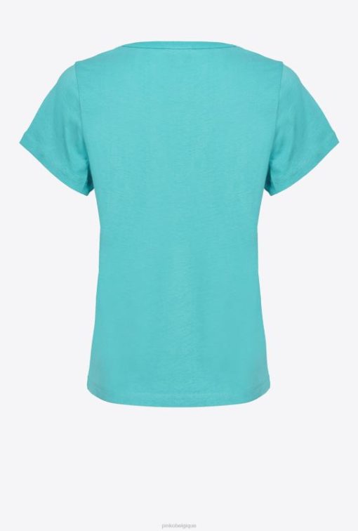 T-shirt à manches courtes en jersey de coton avec col en V côtelé et petit imprimé inséparables Pinko sur le côté gauche devant.