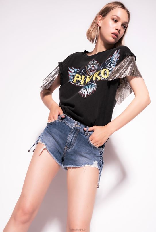 T-shirt long en jersey pur coton avec grand motif d’ailes imprimé et logo pinko. pièce légèrement oversize avec col rond et mancherons agrémentés d’empiècements en maille métallisée. – le mannequin mesure 179 cm et porte une taille 40.
