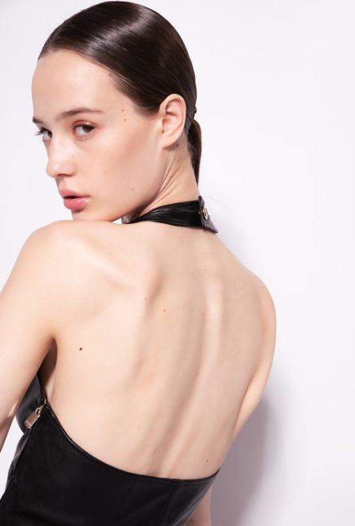top court sans manches en tissu aspect cuir. Fermeture boutonnée en métal, dos nu croisé dans le dos, dos nu et découpe sur le devant. Fermeture boutonnée en métal sur les côtés et intérieur doublé en tissu. – le mannequin mesure 177 cm et porte une taille 40.