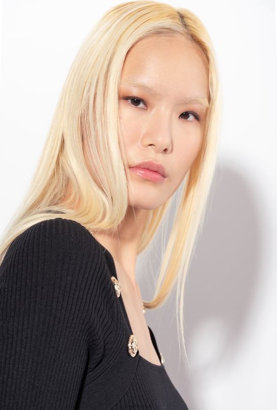 haut ajusté à manches trois-quarts en crêpe de viscose côtelée extensible. doté d’une encolure carrée bordée de boutons en métal doré agrémentés du logo des tourtereaux. – le mannequin mesure 175 cm et porte une taille 40.