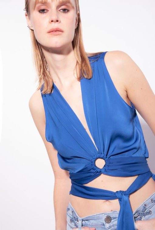 crop top sans manches en tissu fluide ultra léger. épaules froncées et col en V plongeant avec détail anneau et ceinture à nouer dans le même tissu qui se noue à la taille.