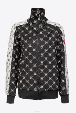 veste à porter comme un sweat-shirt, confectionnée en tissu jacquard en maille extensible avec motif monogramme love bird partout. col montant, manches longues avec bande latérale de couleur contrastée et patch en forme de cœur brodé avec détails brillants sur une manche. ourlet, poignets et poches latérales verticales contrastés. fermeture zippée avec tirette circulaire personnalisée sur le devant.